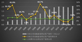 在歷經(jīng)10年的投資高速增長(zhǎng)后,市政公用設(shè)施建設(shè)大體完成,2012年之后投資開始進(jìn)入穩(wěn)定增長(zhǎng)通道,近幾年的投資額基本穩(wěn)定在2萬億左右,占同期全社會(huì)固定資產(chǎn)投資總額的比例持續(xù)下降。2016年全國(guó)市政公用設(shè)施建設(shè)固定資產(chǎn)投資總額為2.1萬億元,占同期全社會(huì)固定資產(chǎn)投資總額的3.4%。